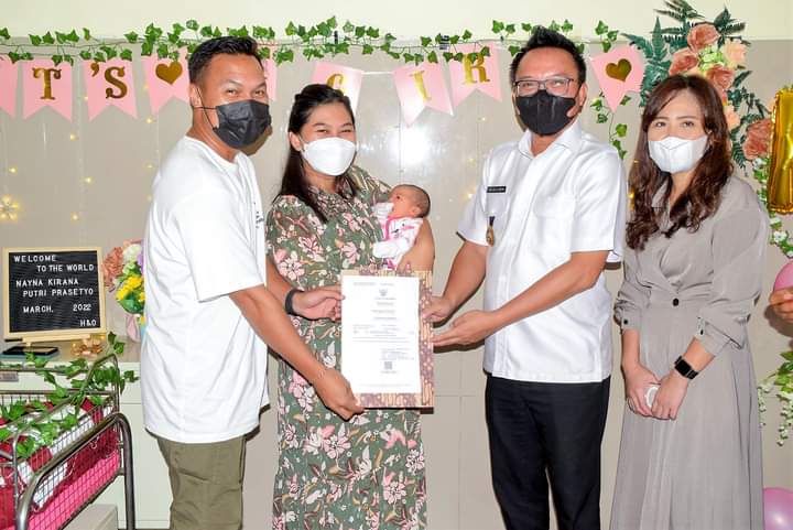 Tak hanya berkunjung. Pada kesempatan tersebut Bupati juga langsung menyerahkan dokumen penting yakni Kartu Identitas Anak (KIA) dan Akta Kelahiran untuk anak pertama mereka bernama Nayna Kirana Putri Prasetyo.