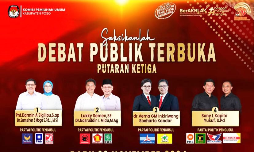 POSO– Debat publik ke tiga bagi pasangan calon Bupati dan Wakil Bupati Poso dijadwalkan akan berlangsung pada 20 November mendatang di Kota Wisata Tentena, Kabupaten Poso, Sulawesi Tengah (Tengah).