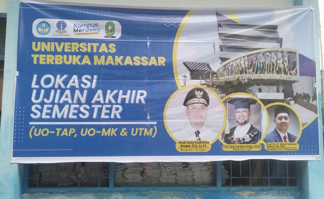 Semua lokasi yang jadi tempat pelaksanaan ujian final bagi 6000 lebih mahasiswa UT Makassar dipasangi spanduk info tentang UT dengan memasang dalam spanduk, foto Rektor UT, Prof Ojat Darojat, M.Bus, Ph.D, Direktur UT Makassar serta foto para bupati di daerah bersangkutan.