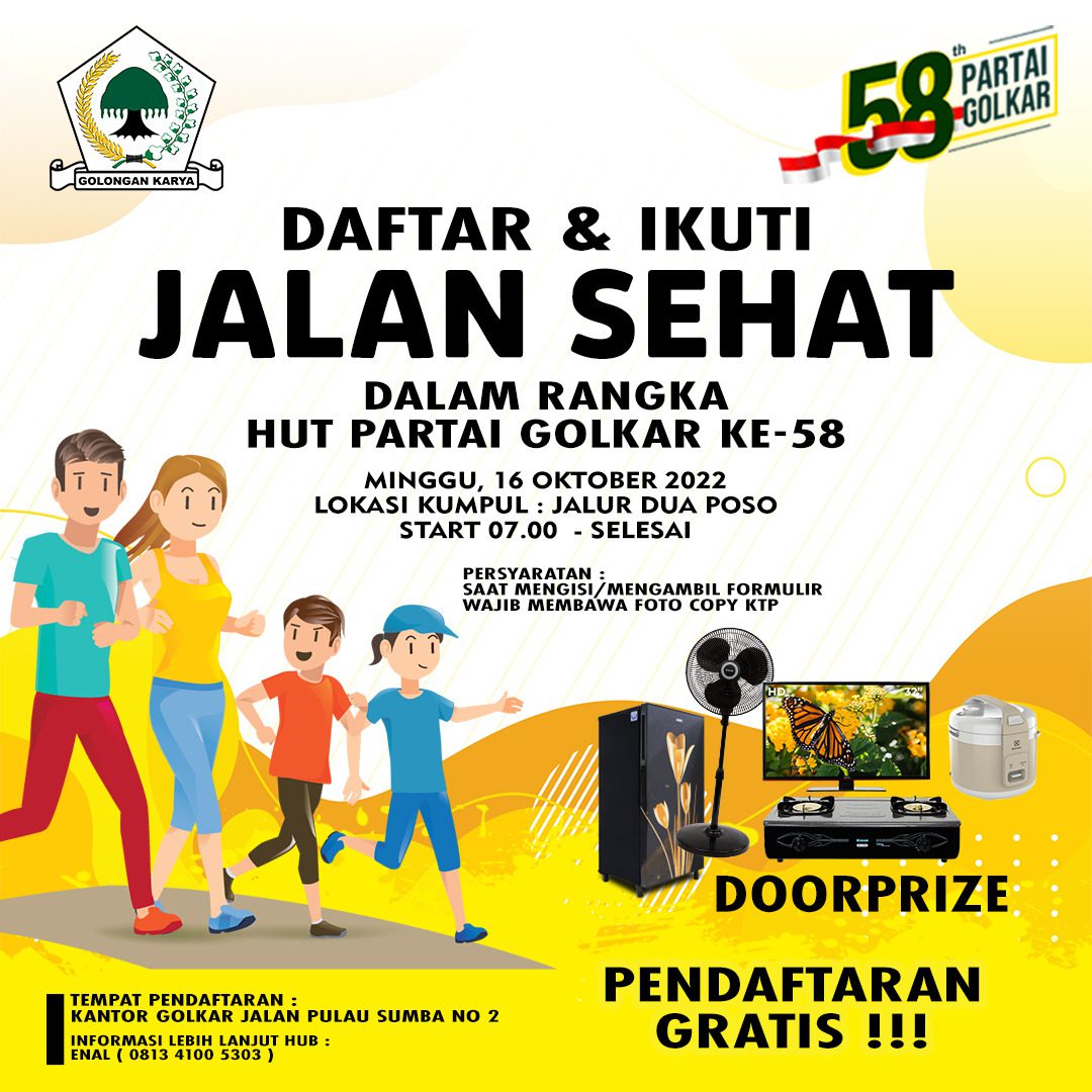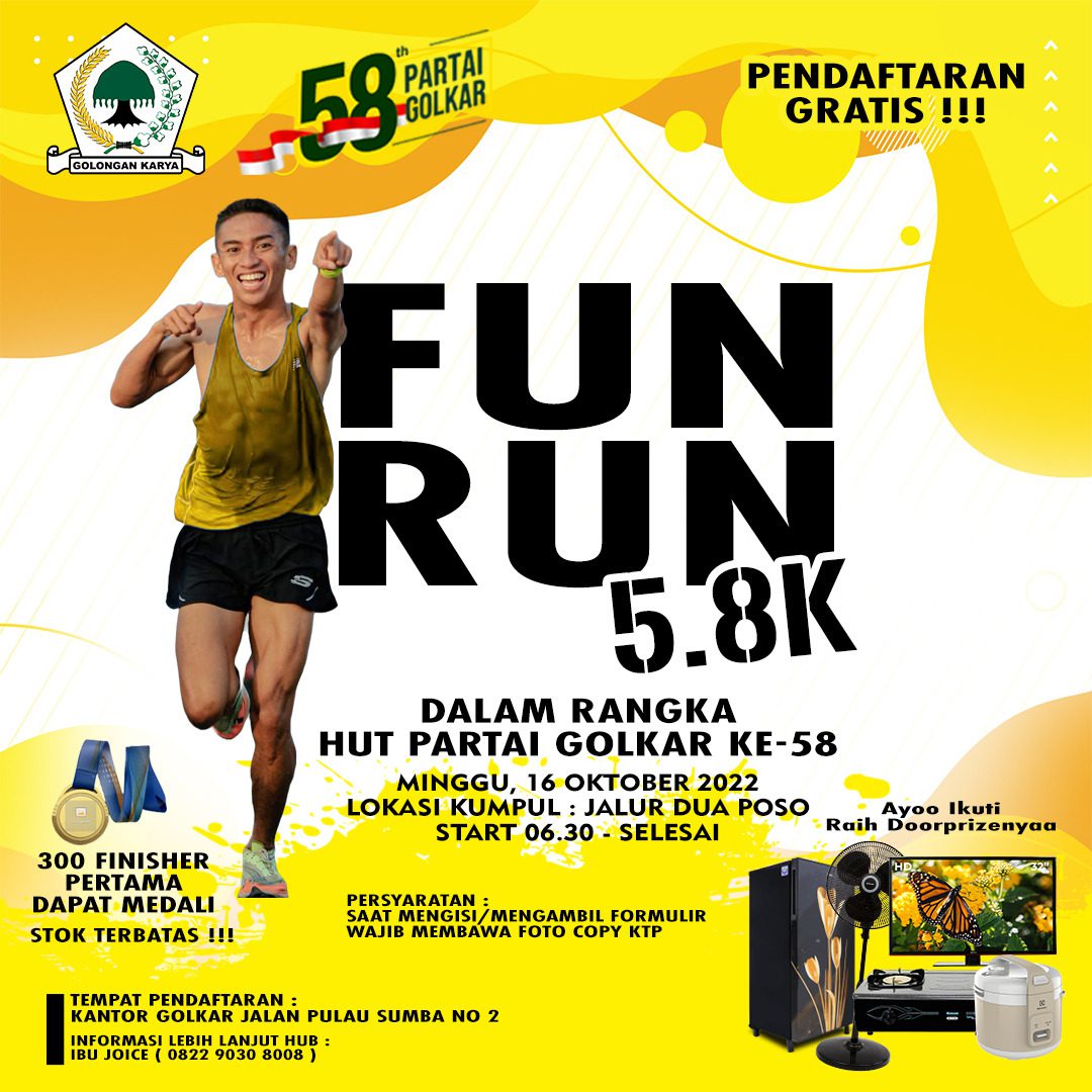 Sementara Ketua Panitia Pelaksana Darmawan Lyanto menyampaikan dalam rangka memeriahkan HUT ke 58 Partai Golkar, secara khusus DPD Golkar Poso akan menggelar kegiatan seperti jalan santai, Fun run 5,8 Km, lomba perahu-perahu, mewarnai styrofoam, lomba mobil legend dan Bhakti sosial.
