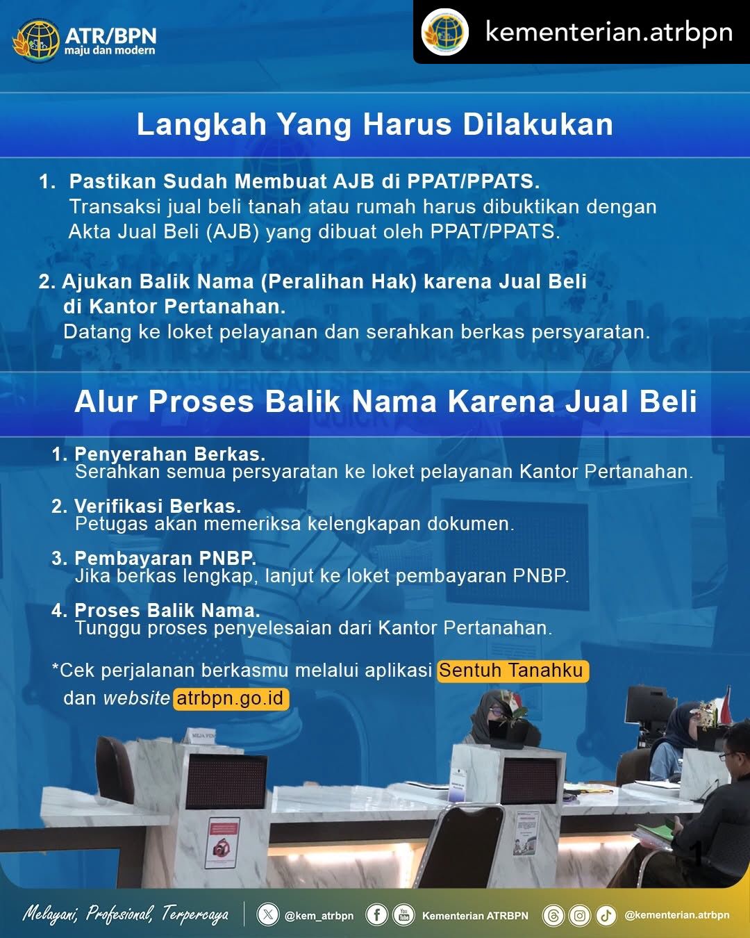 Setelah pembayaran diterima, Kantor Pertanahan akan memproses pencatatan balik nama pada buku tanah dan sertipikat. Untuk memberikan kemudahan, masyarakat kini tidak perlu bolak-balik ke kantor hanya untuk mengecek status berkas.