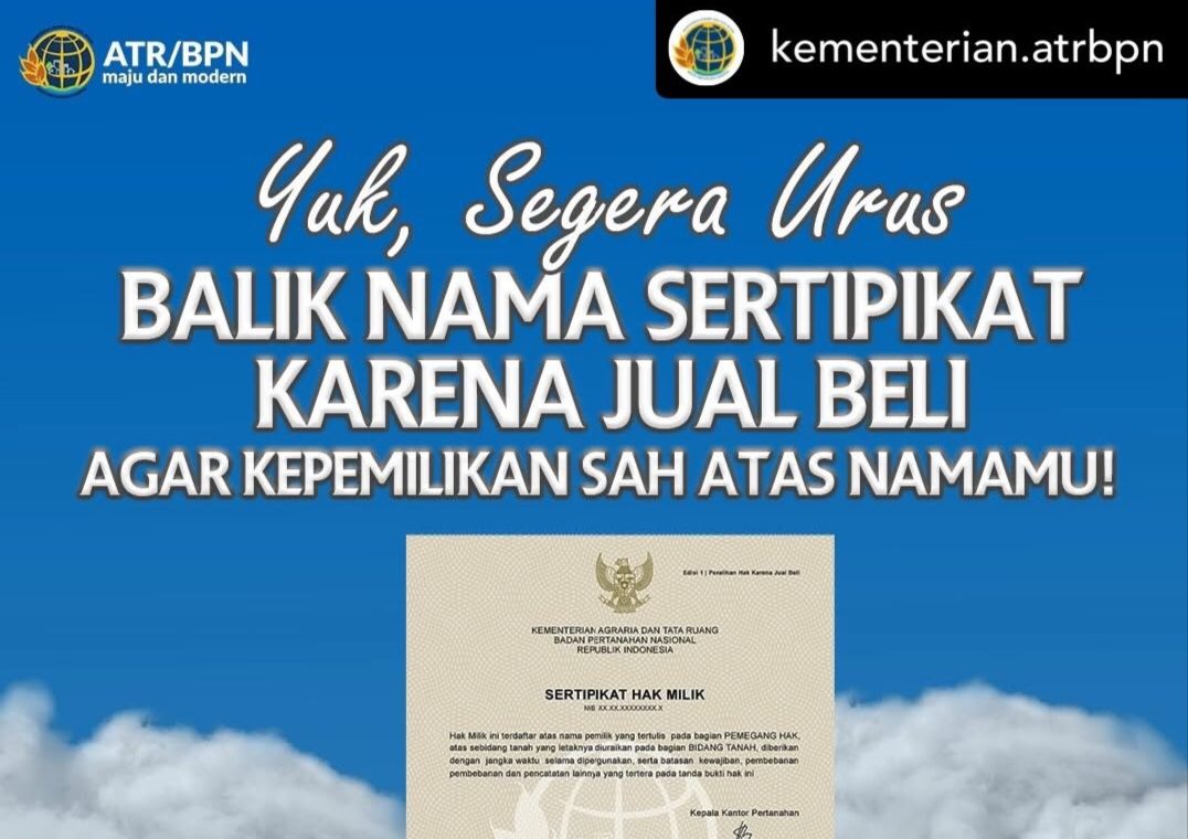 JAKARTA – Kementerian Agraria dan Tata Ruang/Badan Pertanahan Nasional (ATR/BPN) terus mendorong masyarakat untuk segera mengurus balik nama sertipikat tanah setelah melakukan transaksi jual beli. Hal ini penting dilakukan guna memastikan status kepemilikan tanah sah secara hukum atas nama pemilik baru.