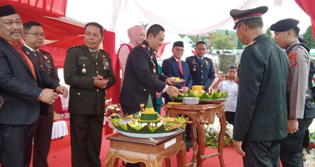 Sebelum acara ditutup secara resmi, dilakukan pemotongan tumpeng dalam rangka HUT ke 77 Bhayangkara yang dilakukan Kapolres bersama bupati.