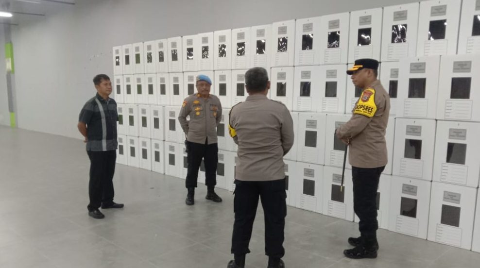 POSO- Kapolres Poso AKBP Arthur Sameaputty, S.I.K bersama dengan jajarannya melakukan pengecekan personil pengamanan ditempatkan pengecetan kotak suara, City Mall, Poso, Selasa (23/01/2024).