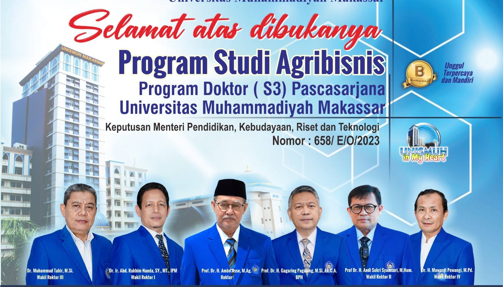 Seperti diketahui Kemendikbudristek melalui surat nomor 5724/E1/HK.03.00/2023, tanggal 9 Agustus 2023, mengumumkan diterbitkannya Keputusan Menteri dengan nomor 658/E/O/2023, berkaitan izin pembukaan Program Studi Agribisnis Program Doktor di Universitas Muhammadiyah (Unismuh) Makassar.