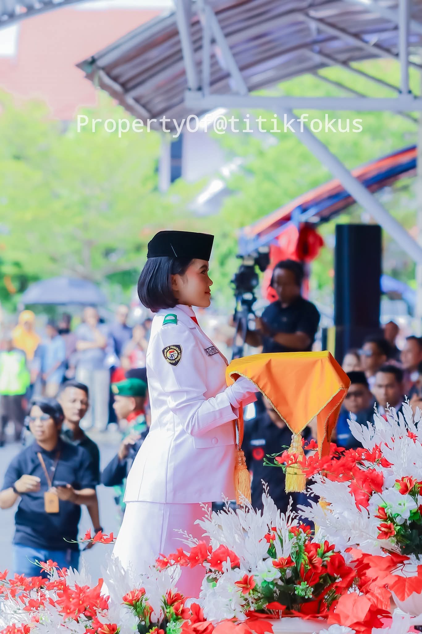 Sosok pelajar yang murah senyum dipilih menjadi pembawa baki bendera merah putih pada Upacara 17 Agustus 2025 di Lapangan Maroso Poso.