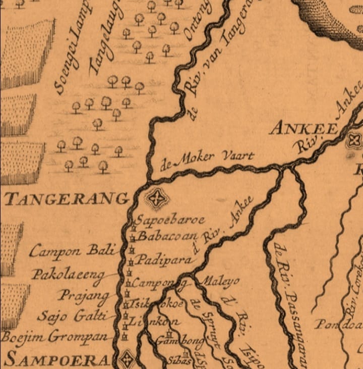 *Pada peta Land 1750 teridentiffikasi antara Anke dan Tanggerang hingga ke laut adalah Tjipeteh, Tjikokol, Babakan, Grendeng, Zuiderringsloot, Zoerendaal, Groote ringsloot, Kapok, Benteng Alang-Alang. Tjenkarang, Westermede, Concordia, Kadaewa Batoestjeper, Kamal, Klappa, Dadap, Pakadjangan, Tandjong Boeroeng, Dadap Roeboboe dan Tandjong Pasir.